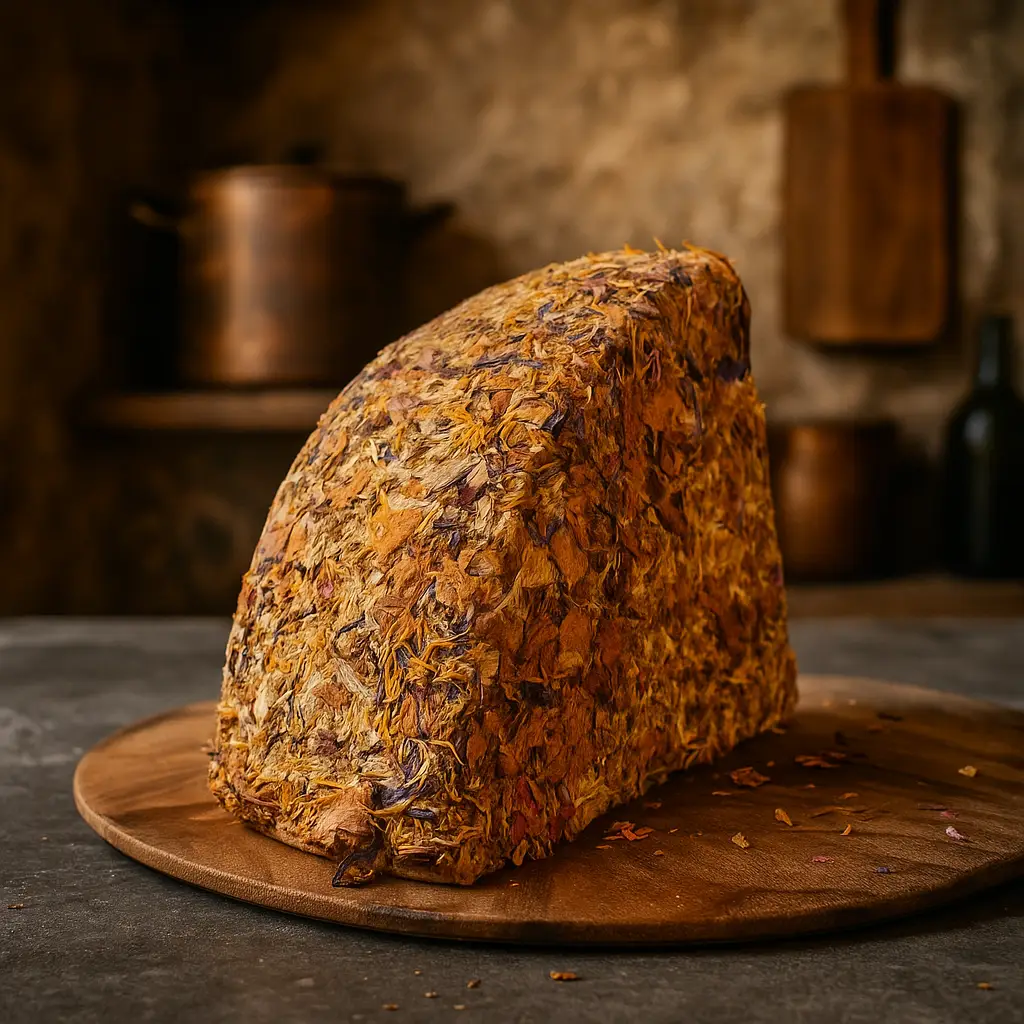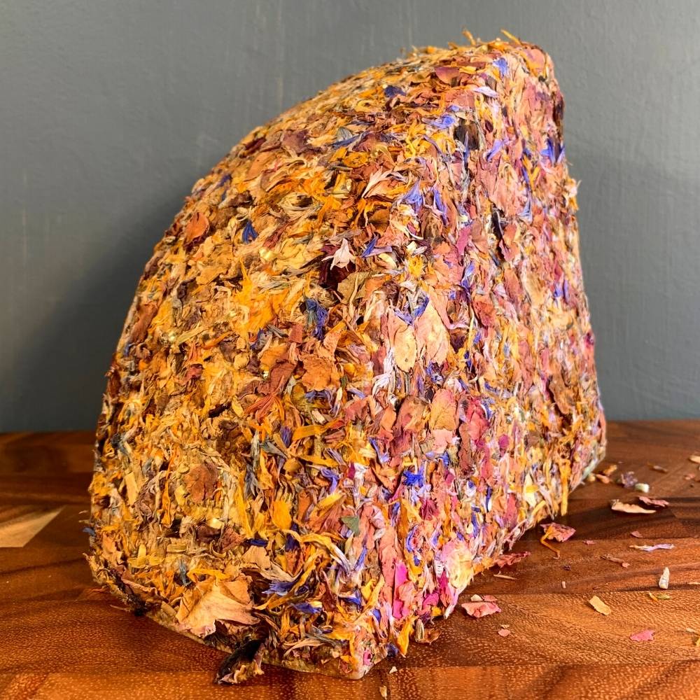 A stunningly beautiful cheese  from the Hofkaiserei Kraus in Austria with a sweet and nutty taste.  The hard pressed cheese is rolled in edible flowers and herbs to give it its distinctive appearance and flavour