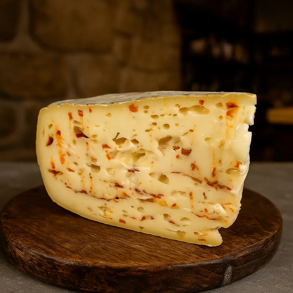 The curds and whey form. The chilli is added. The whey is drained away and the curds gathered and placed into moulds. This is a relatively young cheese that is not pressed. It is dipped in brine and left to mature for 30/40 days.