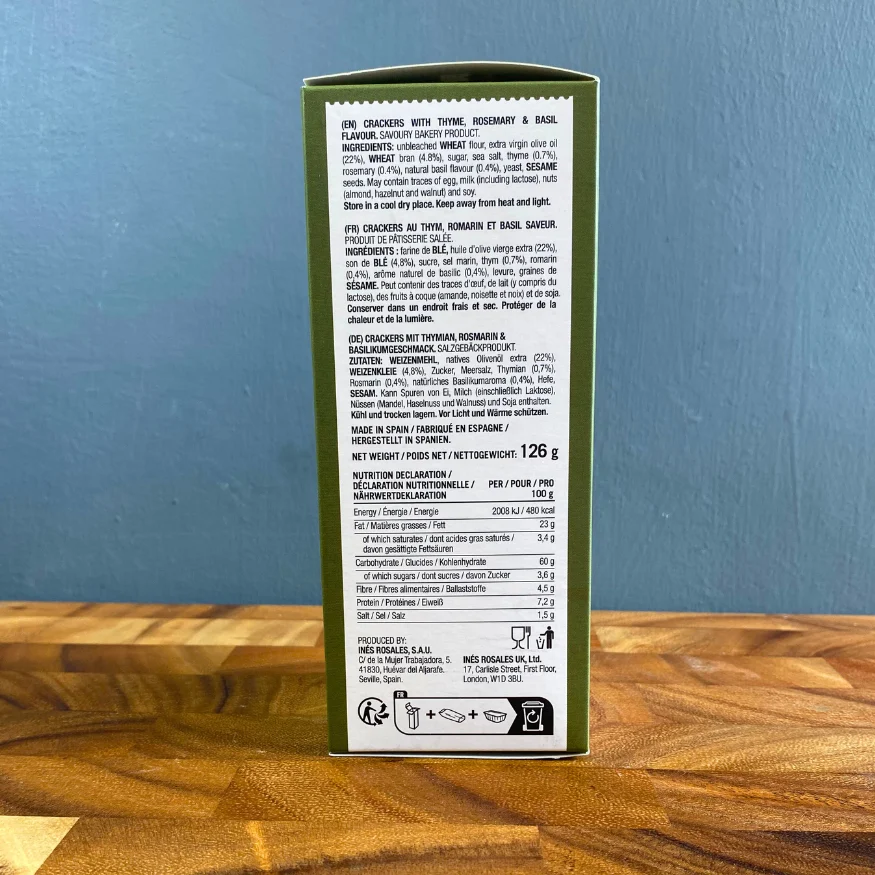 Savoury baked product made with extra virgin olive oil, thyme, rosemary and basil.