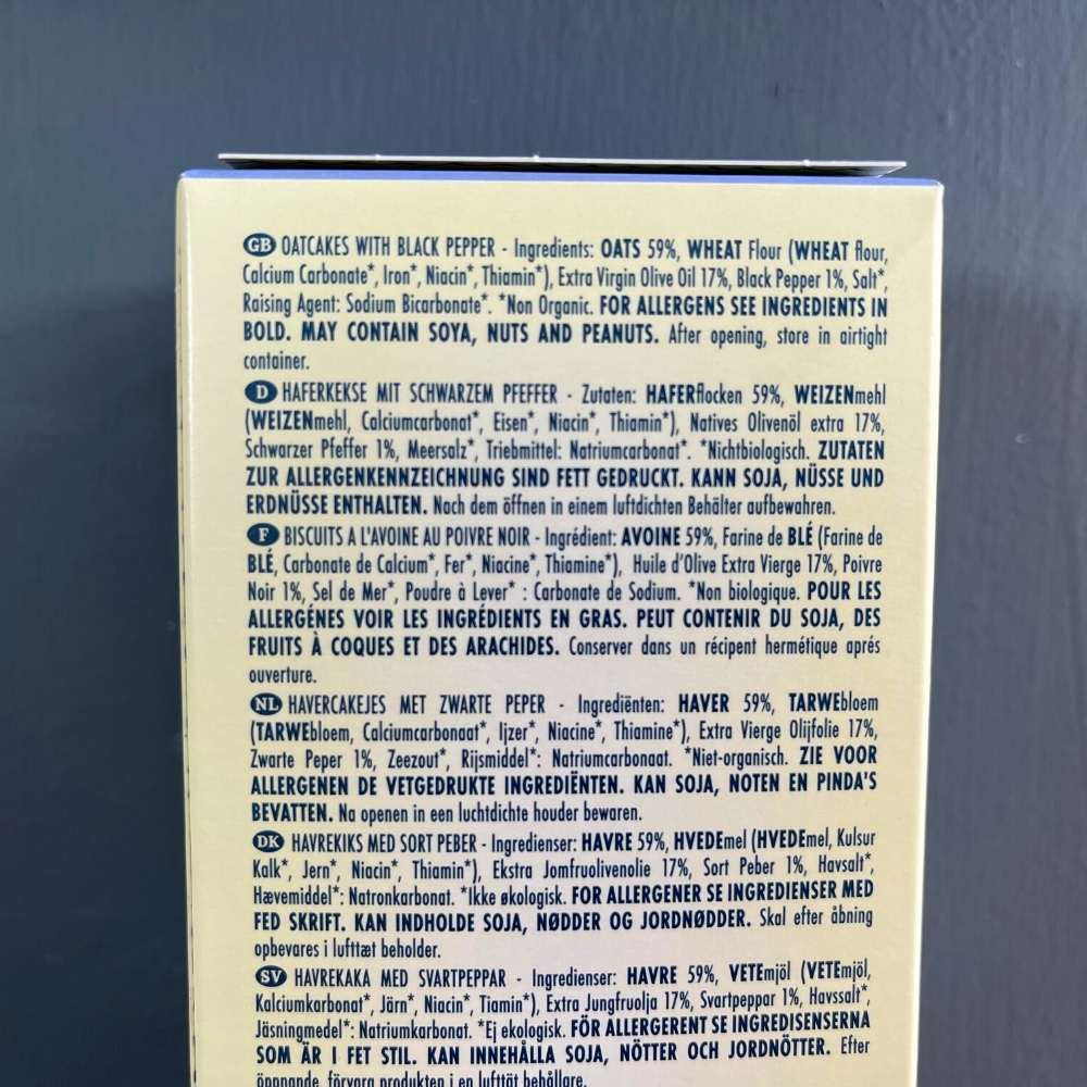Ingredients: Oats, Wheat Flour (Wheat flour, Calcium Carbonate, Iron, Niacin, Thiamin), Extra Virgin Olive Oil, Black Pepper, Salt, Raising Agent: Sodium Bicarbonate.