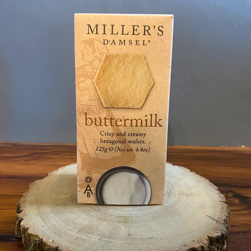 Tangy and creamy wafers. Hexagonal wafers made with buttermilk and butter churned in England.