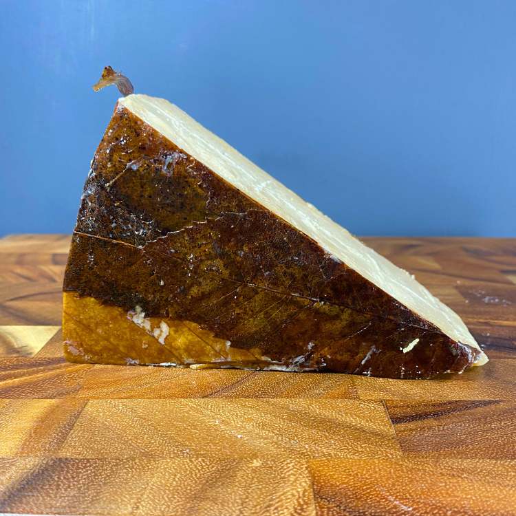 This farmstead cow’s and sheep’s milk cheese is aged for a year and a half and wrapped in chestnut leaves keeping the cheese moist and imparting a heady aroma and sweet flavour. The paste is firm with a crumbly texture and an earthy aroma gives way to a sweet, nutty and slightly musty flavour.